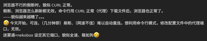 想问一下大家,没有用nekobox的,直接用迷雾通在努力尝试连接的朋友,大家都是怎么样的情况呢?还是一连就断吗?